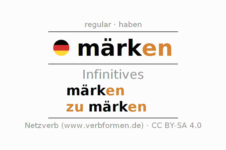 The infinitives of märken (mark, label) are: märken, zu märken. The ending -en is appended to the verb stem märk. When forming the infinitive with zu, the "zu" is prepended to the verb, since it has no separable first parts. The formation of the forms corresponds to the grammatical rules for the conjugation of verbs in the infinitive. Comments ☆