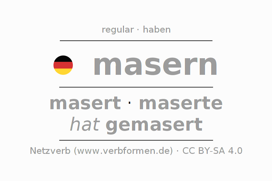The infinitives of masern (grain, texture) are: masern, zu masern. The ending -n, shortened by an "e", is appended to the verb stem maser, since the stem ends with -er. When forming the infinitive with zu, the "zu" is prepended to the verb, since it has no separable first parts. The formation of the forms corresponds to the grammatical rules for the conjugation of verbs in the infinitive. Comments ☆