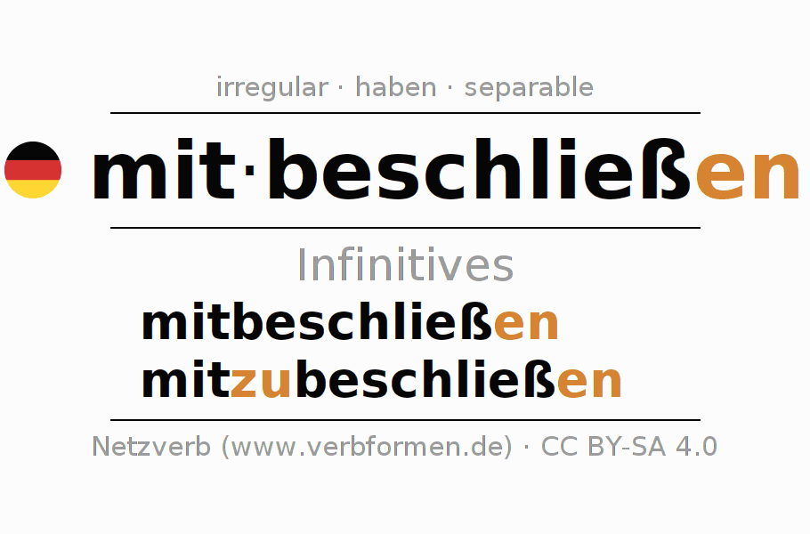 The infinitives of mitbeschließen (co-decide, jointly decide) are: mitbeschließen, mitzubeschließen. The ending -en is appended to the verb stem schließ. When forming the infinitive with zu the "zu" is inserted after the separable first part mit-. The formation of the forms corresponds to the grammatical rules for the conjugation of verbs in the infinitive. Comments ☆