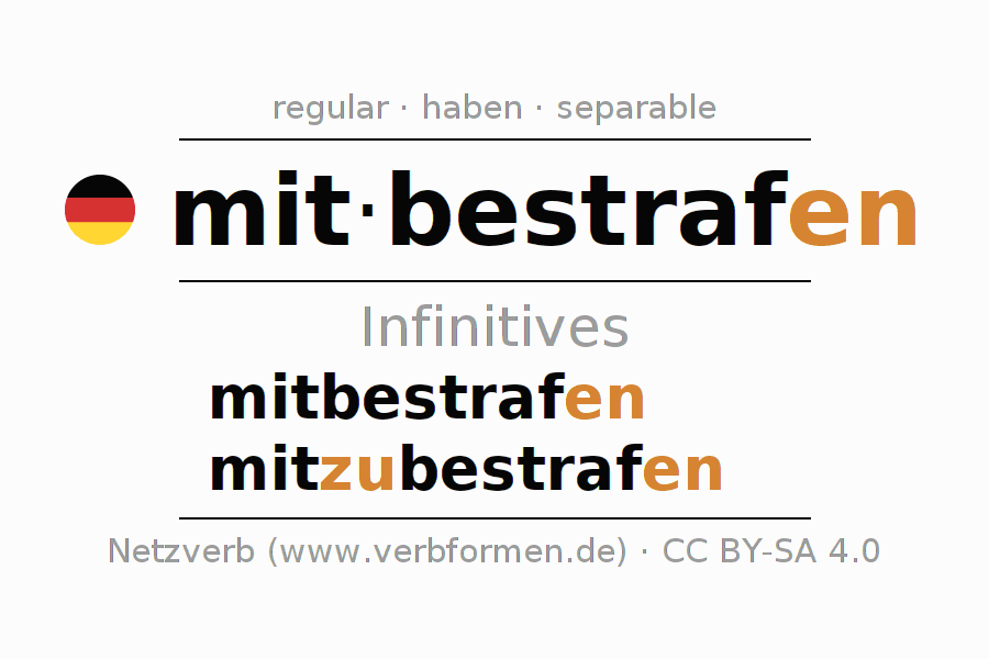 The infinitives of mitbestrafen (punish jointly, punish together) are: mitbestrafen, mitzubestrafen. The ending -en is appended to the verb stem straf. When forming the infinitive with zu the "zu" is inserted after the separable first part mit-. The formation of the forms corresponds to the grammatical rules for the conjugation of verbs in the infinitive. Comments ☆