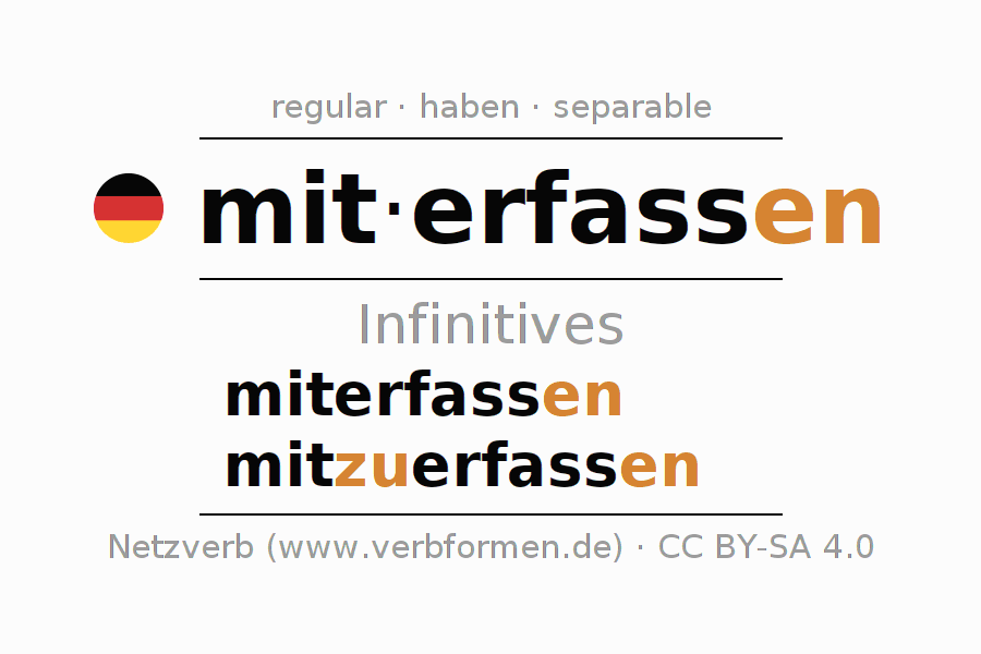 The infinitives of miterfassen (capture together, include) are: miterfassen, mitzuerfassen. The ending -en is appended to the verb stem fass. When forming the infinitive with zu the "zu" is inserted after the separable first part mit-. The formation of the forms corresponds to the grammatical rules for the conjugation of verbs in the infinitive. Comments ☆