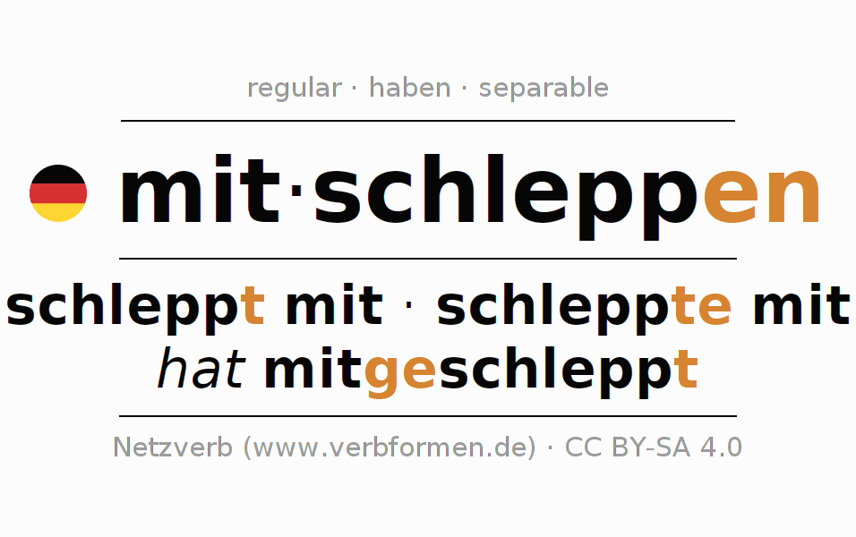 The verb mitschleppen fully conjugated in all persons and numbers in the Infinitive Present Perfect
