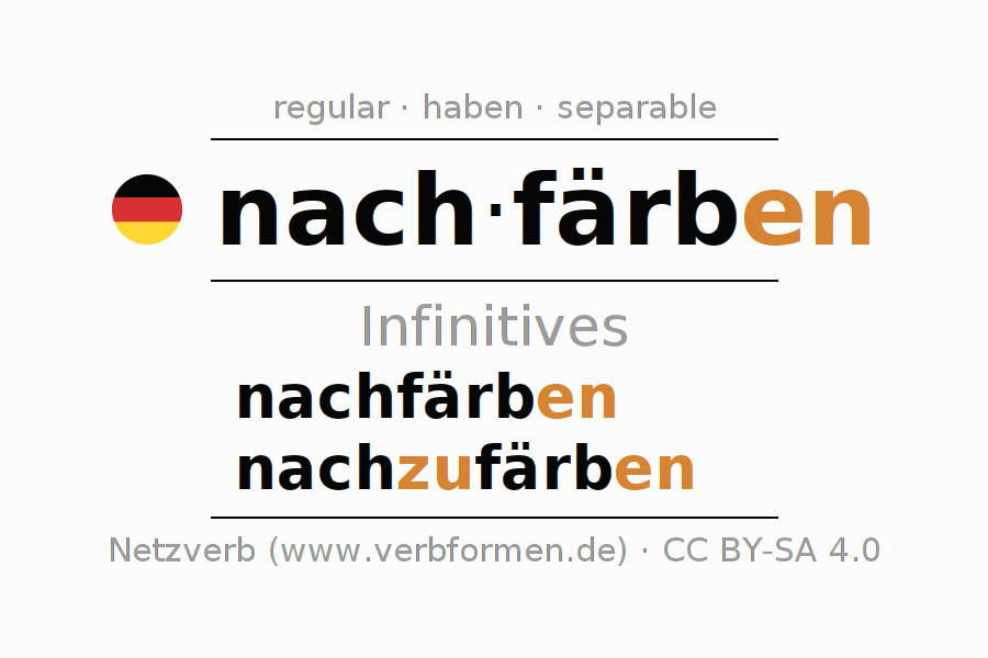 The infinitives of nachfärben (recolour, redye) are: nachfärben, nachzufärben. The ending -en is appended to the verb stem färb. When forming the infinitive with zu the "zu" is inserted after the separable first part nach-. The formation of the forms corresponds to the grammatical rules for the conjugation of verbs in the infinitive. Comments ☆
