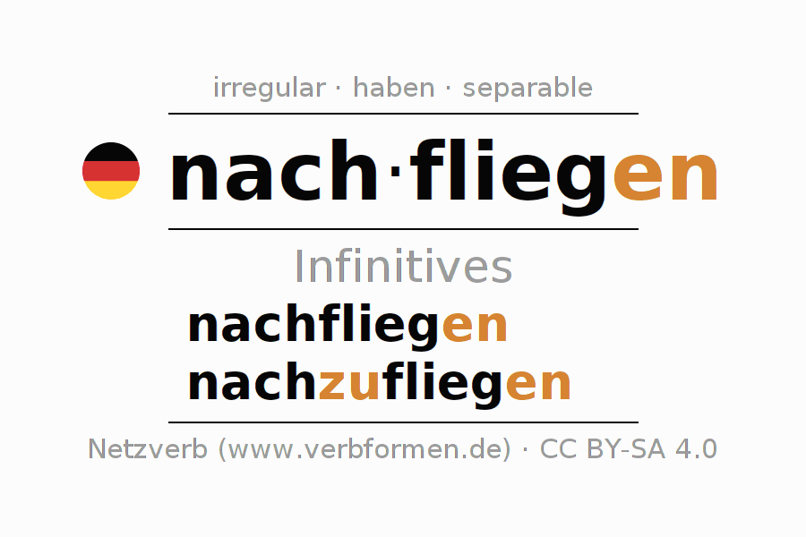 The infinitives of nachfliegen (follow) are: nachfliegen, nachzufliegen. The ending -en is appended to the verb stem flieg. When forming the infinitive with zu the "zu" is inserted after the separable first part nach-. The formation of the forms corresponds to the grammatical rules for the conjugation of verbs in the infinitive. Comments ☆