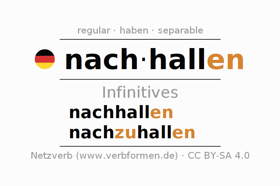 The infinitives of nachhallen (echo, resonate) are: nachhallen, nachzuhallen. The ending -en is appended to the verb stem hall. When forming the infinitive with zu the "zu" is inserted after the separable first part nach-. The formation of the forms corresponds to the grammatical rules for the conjugation of verbs in the infinitive. Comments ☆