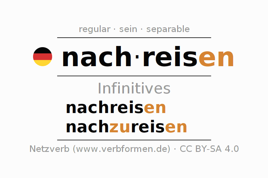 The infinitives of nachreisen (chase, follow) are: nachreisen, nachzureisen. The ending -en is appended to the verb stem reis. When forming the infinitive with zu the "zu" is inserted after the separable first part nach-. The formation of the forms corresponds to the grammatical rules for the conjugation of verbs in the infinitive. Comments ☆