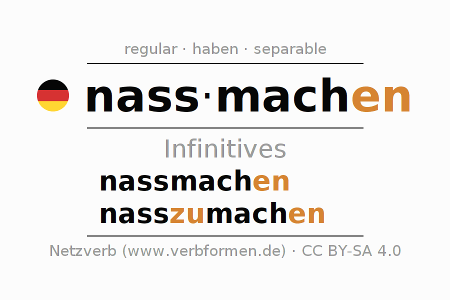 The infinitives of nassmachen (wet, drench) are: nassmachen, nasszumachen. The ending -en is appended to the verb stem mach. When forming the infinitive with zu the "zu" is inserted after the separable first part nass-. The formation of the forms corresponds to the grammatical rules for the conjugation of verbs in the infinitive. Comments ☆