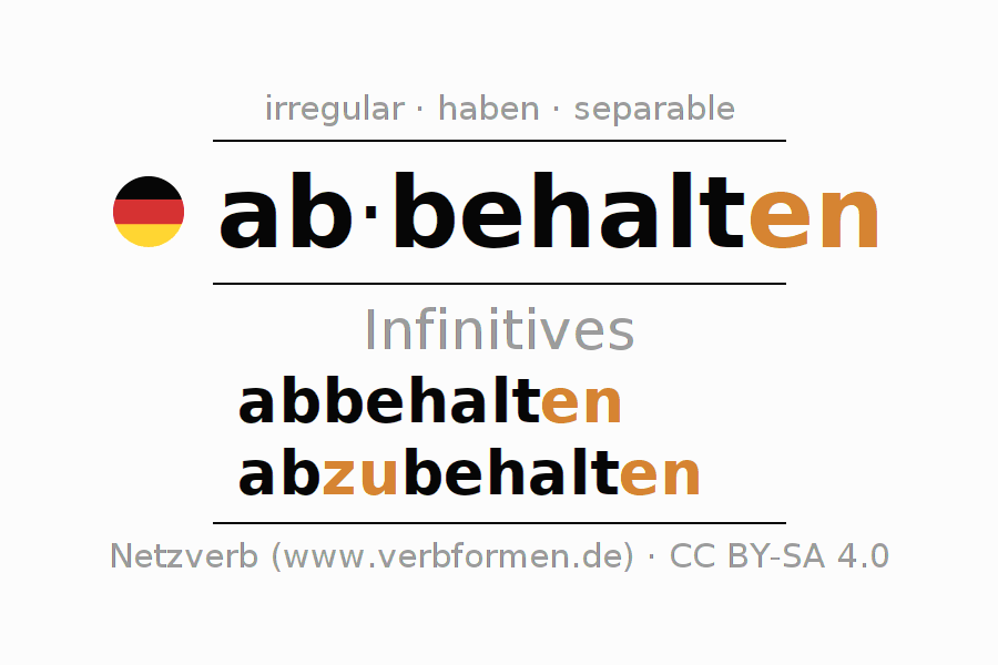 The conjugation of abbehalten in Infinitive Present Perfect base form Active is abbehalten, abzubehalten.The conjugation corresponds to certain grammatical rules. Likewise the requirements for the conjugation of the simple verb forms of abbehalten in Infinitive. Comments ☆