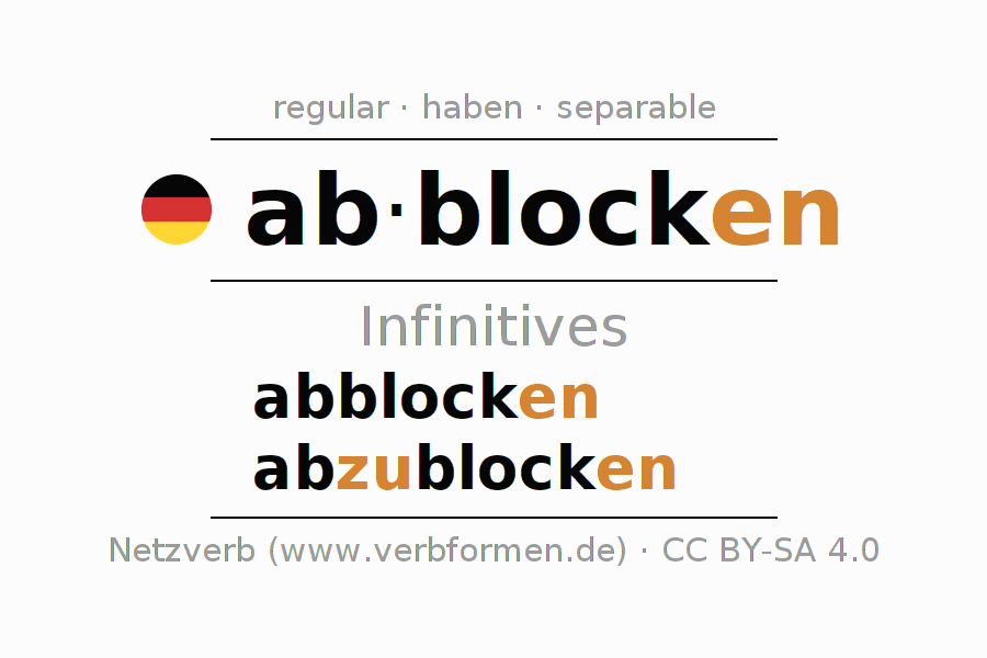 The conjugation of abblocken in Infinitive Present Perfect base form Active is abblocken, abzublocken.The conjugation corresponds to certain grammatical rules. Likewise the requirements for the conjugation of the simple verb forms of abblocken in Infinitive. Comments ☆