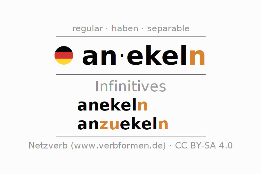 The conjugation of anekeln in Infinitive Present Perfect base form Active is anekeln, anzuekeln.The conjugation corresponds to certain grammatical rules. Likewise the requirements for the conjugation of the simple verb forms of anekeln in Infinitive. Comments ☆