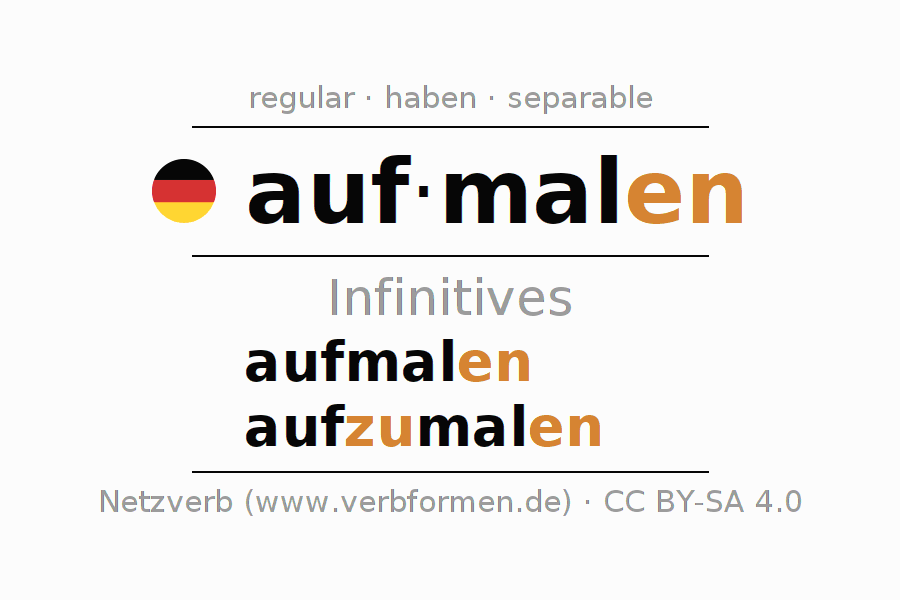 The conjugation of aufmalen in Infinitive Present Perfect base form Active is aufmalen, aufzumalen.The conjugation corresponds to certain grammatical rules. Likewise the requirements for the conjugation of the simple verb forms of aufmalen in Infinitive. Comments ☆
