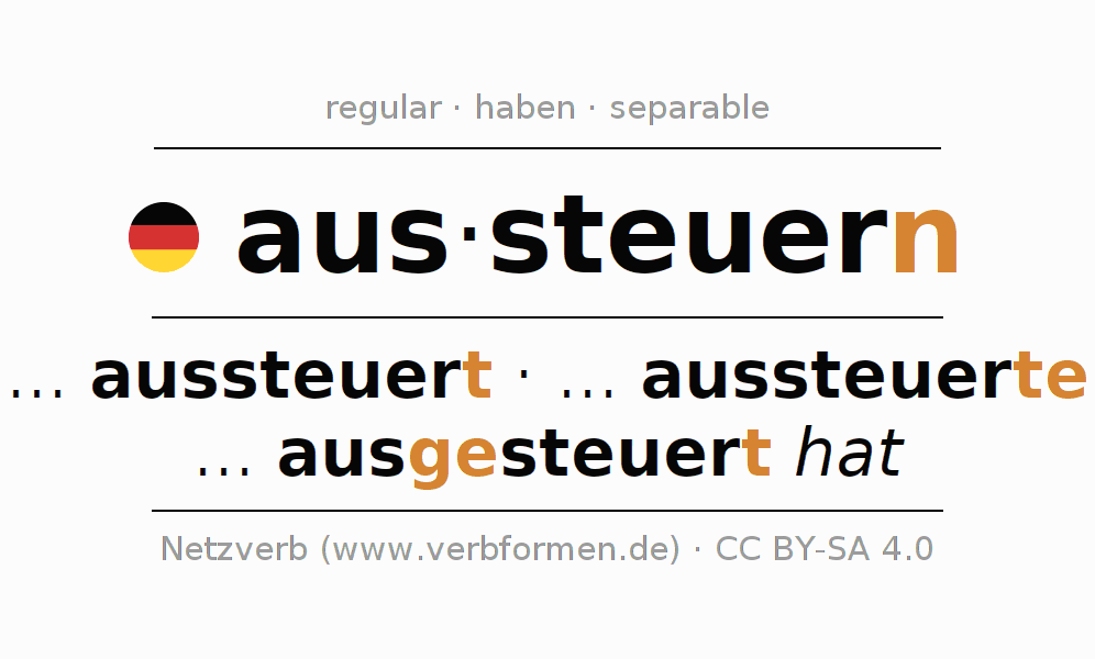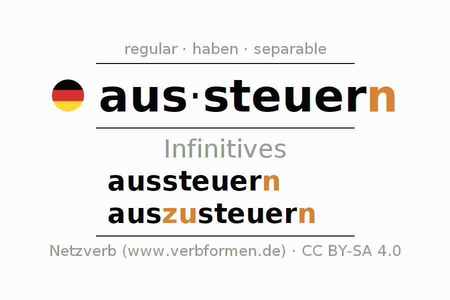 The conjugation of aussteuern in Infinitive Present Perfect base form Active is aussteuern, auszusteuern.The conjugation corresponds to certain grammatical rules. Likewise the requirements for the conjugation of the simple verb forms of aussteuern in Infinitive. Comments ☆