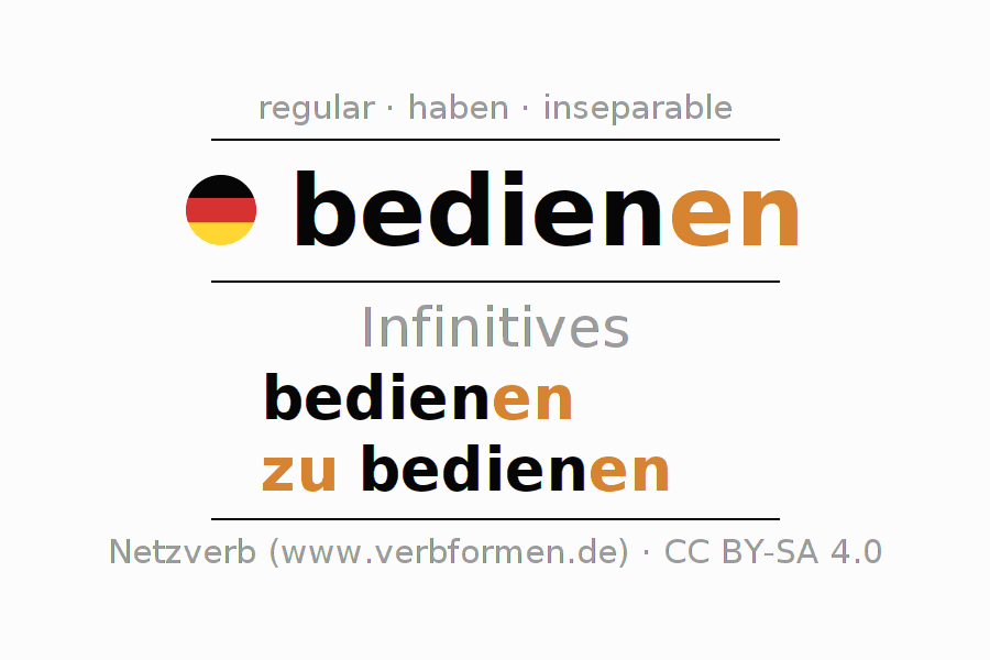 The conjugation of bedienen in Infinitive Present Perfect base form Active is bedienen, zu bedienen.The conjugation corresponds to certain grammatical rules. Likewise the requirements for the conjugation of the simple verb forms of bedienen in Infinitive. Comments ☆