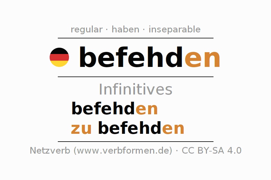 The conjugation of befehden in Infinitive Present Perfect base form Active is befehden, zu befehden.The conjugation corresponds to certain grammatical rules. Likewise the requirements for the conjugation of the simple verb forms of befehden in Infinitive. Comments ☆