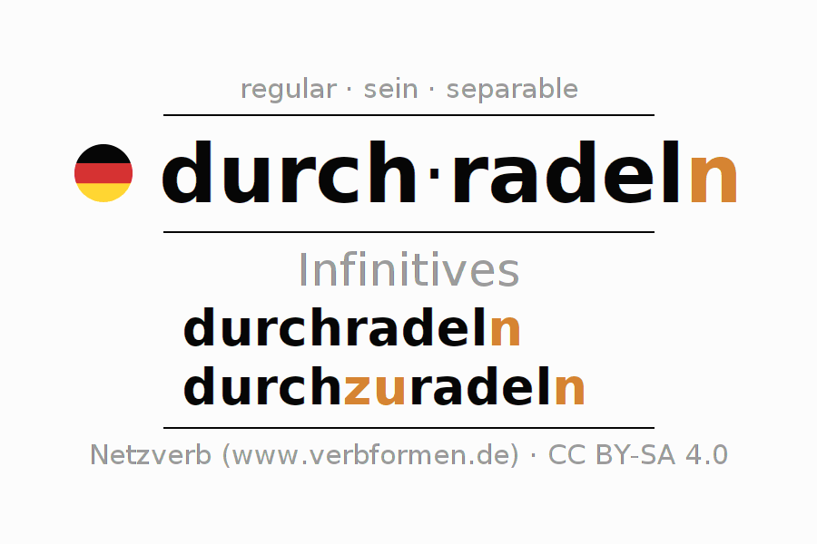 The conjugation of durchradeln in Infinitive Present Perfect base form Active is durchradeln, durchzuradeln.The conjugation corresponds to certain grammatical rules. Likewise the requirements for the conjugation of the simple verb forms of durchradeln in Infinitive. Comments ☆