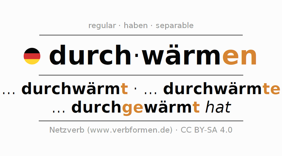 The conjugation of durchwärmen in Infinitive Present Perfect base form Active is durchwärmen, durchzuwärmen.The conjugation corresponds to certain grammatical rules. Likewise the requirements for the conjugation of the simple verb forms of durchwärmen in Infinitive. Comments ☆