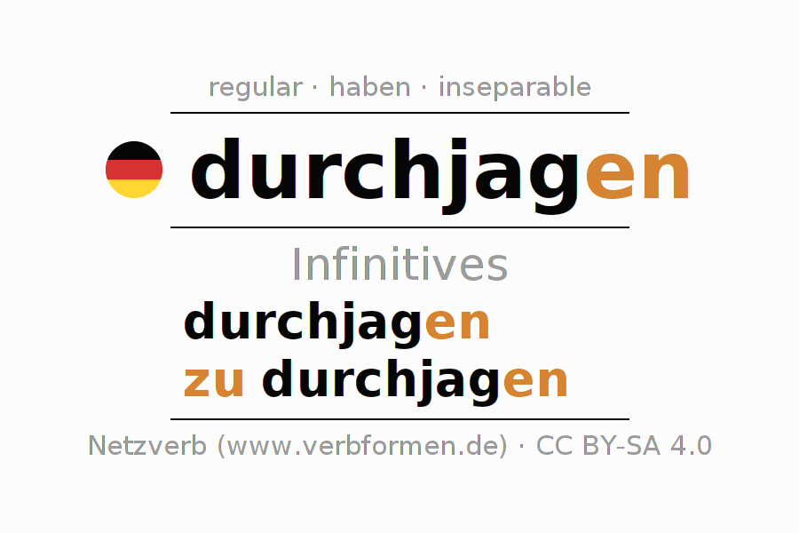 The conjugation of durchjagen in Infinitive Present Perfect base form Active is durchjagen, zu durchjagen.The conjugation corresponds to certain grammatical rules. Likewise the requirements for the conjugation of the simple verb forms of durchjagen in Infinitive. Comments ☆