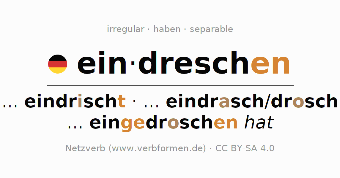The verb eindreschen fully conjugated in all persons and numbers in the Infinitive Present Perfect