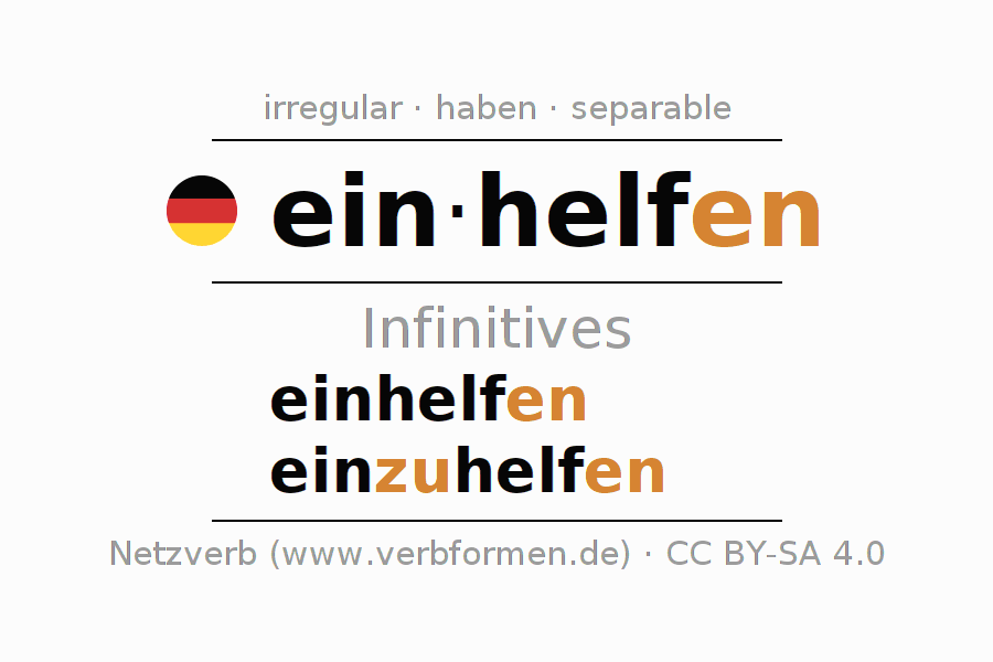The conjugation of einhelfen in Infinitive Present Perfect base form Active is einhelfen, einzuhelfen.The conjugation corresponds to certain grammatical rules. Likewise the requirements for the conjugation of the simple verb forms of einhelfen in Infinitive. Comments ☆