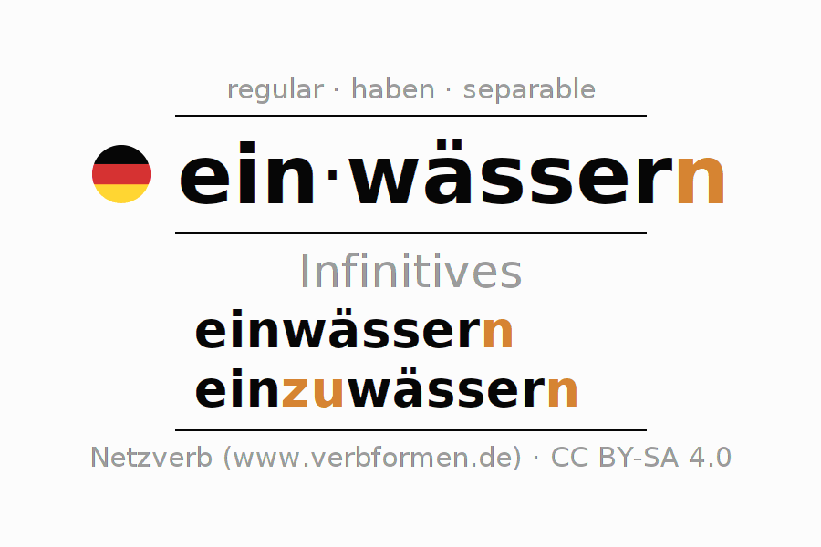 The verb einwässern fully conjugated in all persons and numbers in the Infinitive Present Perfect