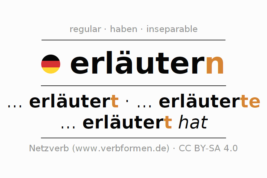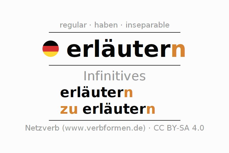 The conjugation of erläutern in Infinitive Present Perfect base form Active is erläutern, zu erläutern.The conjugation corresponds to certain grammatical rules. Likewise the requirements for the conjugation of the simple verb forms of erläutern in Infinitive. Comments ☆