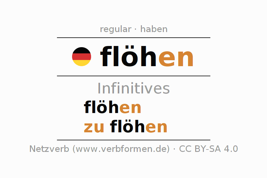 The conjugation of flöhen in Infinitive Present Perfect base form Active is flöh(e)n, zu flöh(e)n.The conjugation corresponds to certain grammatical rules. Likewise the requirements for the conjugation of the simple verb forms of flöhen in Infinitive. Comments ☆