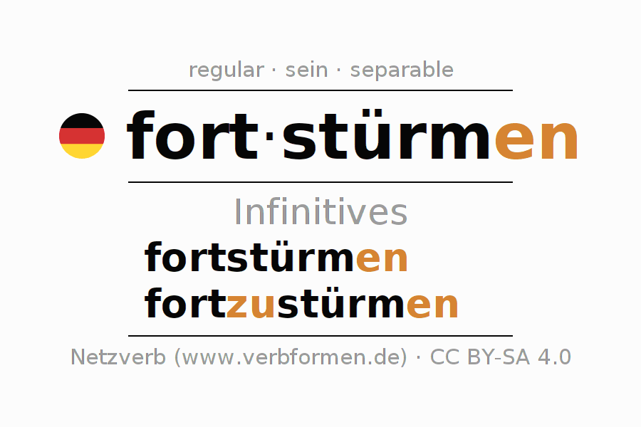 The conjugation of fortstürmen in Infinitive Present Perfect base form Active is fortstürmen, fortzustürmen.The conjugation corresponds to certain grammatical rules. Likewise the requirements for the conjugation of the simple verb forms of fortstürmen in Infinitive. Comments ☆