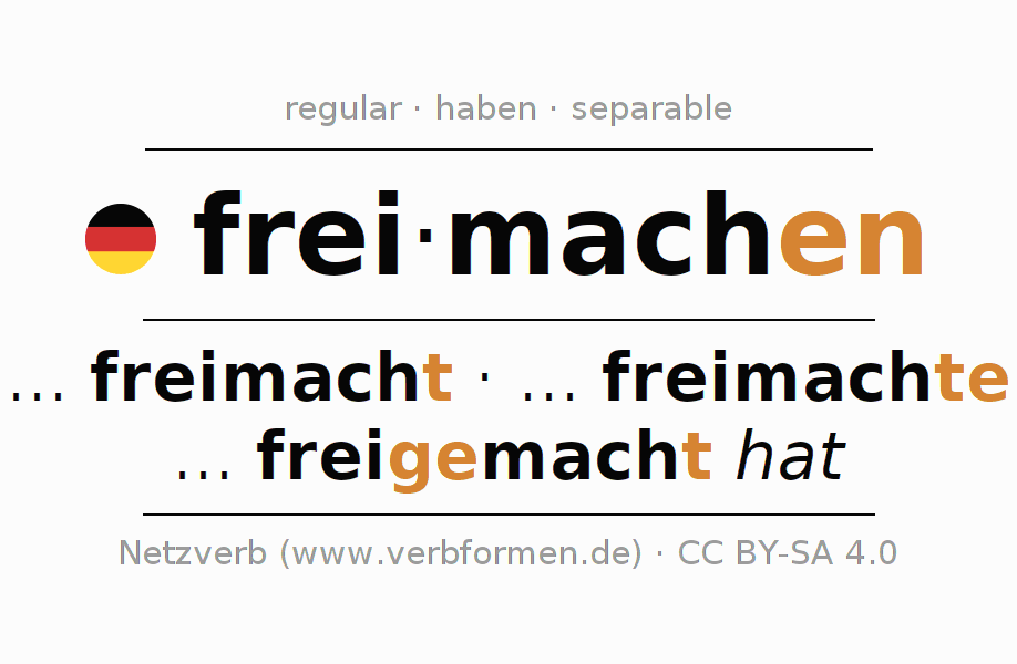 The conjugation of freimachen in Infinitive Present Perfect base form Active is freimachen, freizumachen.The conjugation corresponds to certain grammatical rules. Likewise the requirements for the conjugation of the simple verb forms of freimachen in Infinitive. Comments ☆