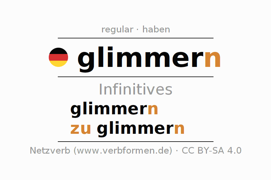 The conjugation of glimmern in Infinitive Present Perfect base form Active is glimmern, zu glimmern.The conjugation corresponds to certain grammatical rules. Likewise the requirements for the conjugation of the simple verb forms of glimmern in Infinitive. Comments ☆