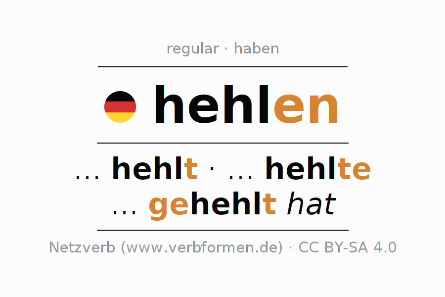 The conjugation of hehlen in Infinitive Present Perfect base form Active is hehlen, zu hehlen.The conjugation corresponds to certain grammatical rules. Likewise the requirements for the conjugation of the simple verb forms of hehlen in Infinitive. Comments ☆