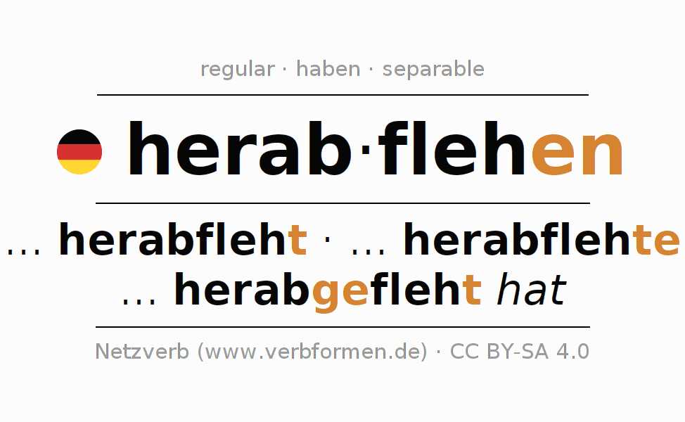 The verb herabflehen fully conjugated in all persons and numbers in the Infinitive Present Perfect