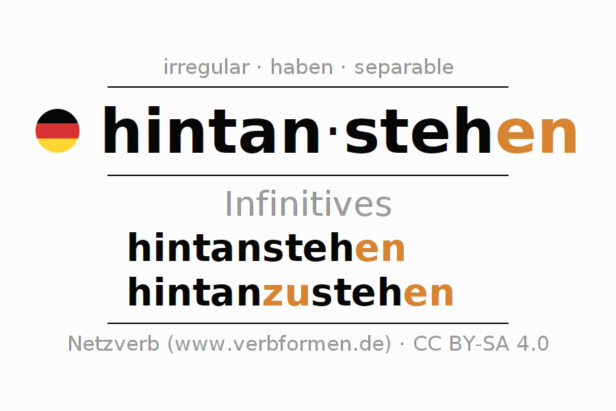 The conjugation of hintanstehen in Infinitive Present Perfect base form Active is hintansteh(e)n, hintanzusteh(e)n.The conjugation corresponds to certain grammatical rules. Likewise the requirements for the conjugation of the simple verb forms of hintanstehen in Infinitive. Comments ☆