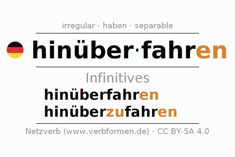 The conjugation of hinüberfahren in Infinitive Present Perfect base form Active is hinüberfahren, hinüberzufahren.The conjugation corresponds to certain grammatical rules. Likewise the requirements for the conjugation of the simple verb forms of hinüberfahren in Infinitive. Comments ☆