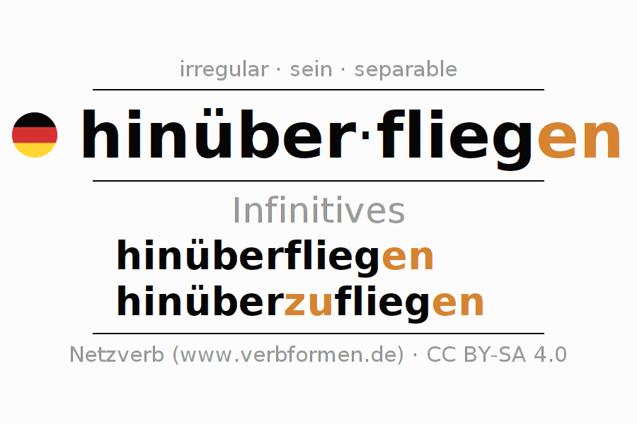 The conjugation of hinüberfliegen in Infinitive Present Perfect base form Active is hinüberfliegen, hinüberzufliegen.The conjugation corresponds to certain grammatical rules. Likewise the requirements for the conjugation of the simple verb forms of hinüberfliegen in Infinitive. Comments ☆