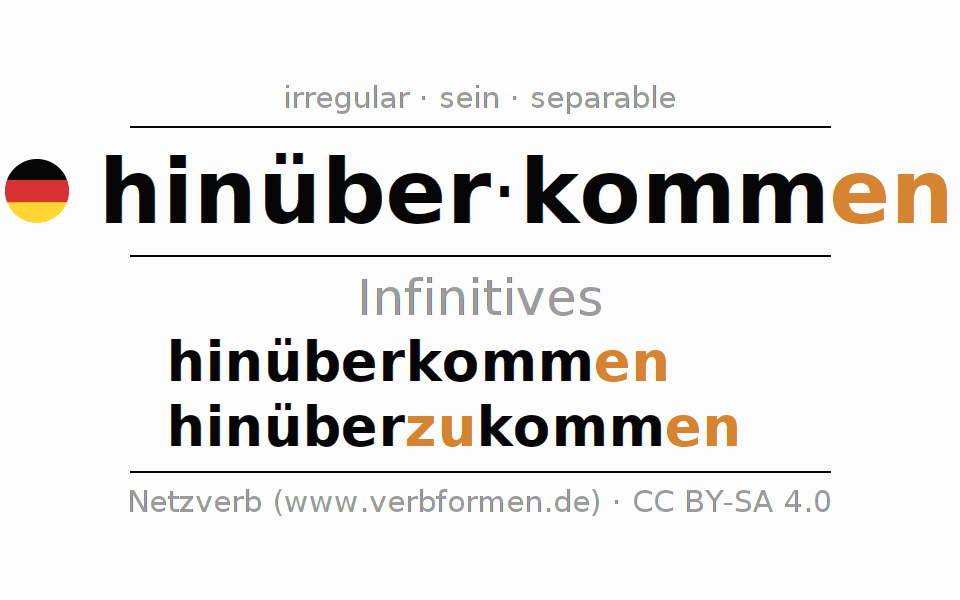 The conjugation of hinüberkommen in Infinitive Present Perfect base form Active is hinüberkommen, hinüberzukommen.The conjugation corresponds to certain grammatical rules. Likewise the requirements for the conjugation of the simple verb forms of hinüberkommen in Infinitive. Comments ☆