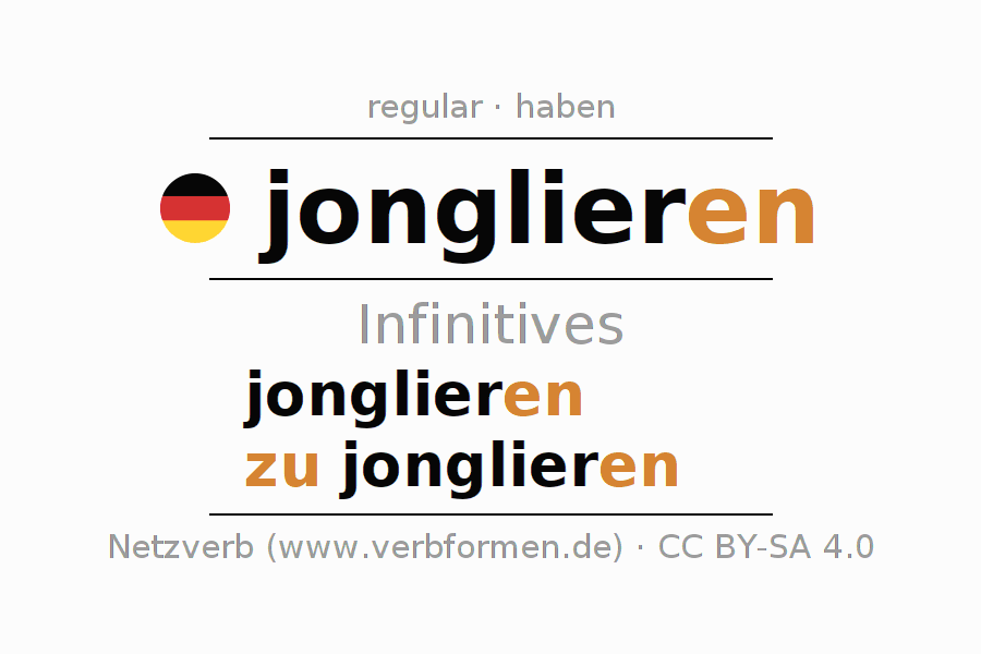 The verb jonglieren fully conjugated in all persons and numbers in the Infinitive Present Perfect
