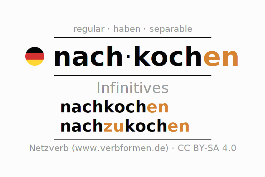The conjugation of nachkochen in Infinitive Present Perfect base form Active is nachkochen, nachzukochen.The conjugation corresponds to certain grammatical rules. Likewise the requirements for the conjugation of the simple verb forms of nachkochen in Infinitive. Comments ☆