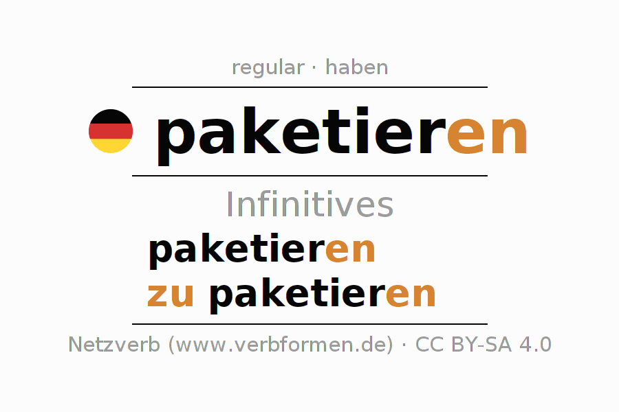 The verb paketieren fully conjugated in all persons and numbers in the Infinitive Present Perfect