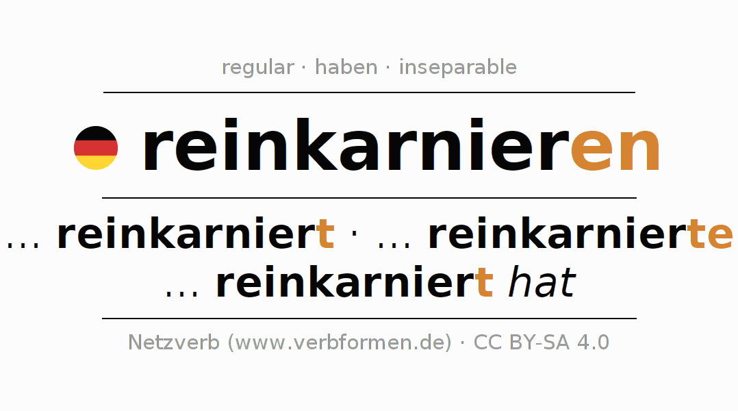The verb reinkarnieren fully conjugated in all persons and numbers in the Infinitive Present Perfect