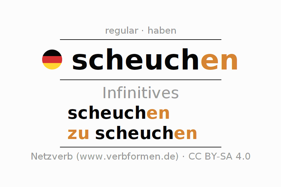 The conjugation of scheuchen in Infinitive Present Perfect base form Active is scheuchen, zu scheuchen.The conjugation corresponds to certain grammatical rules. Likewise the requirements for the conjugation of the simple verb forms of scheuchen in Infinitive. Comments ☆