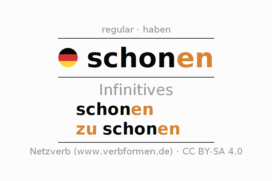 The conjugation of schonen in Infinitive Present Perfect base form Active is schonen, zu schonen.The conjugation corresponds to certain grammatical rules. Likewise the requirements for the conjugation of the simple verb forms of schonen in Infinitive. Comments ☆