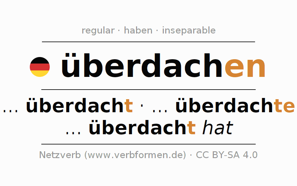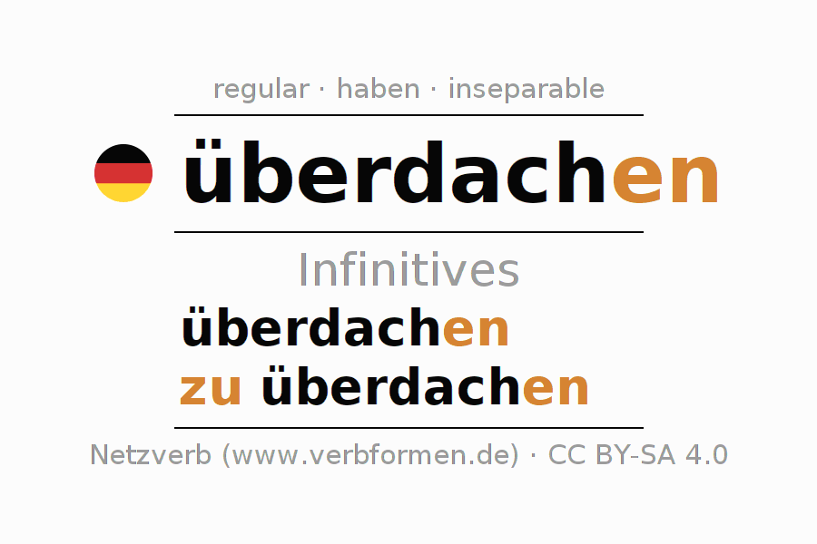 The conjugation of überdachen in Infinitive Present Perfect base form Active is überdachen, zu überdachen.The conjugation corresponds to certain grammatical rules. Likewise the requirements for the conjugation of the simple verb forms of überdachen in Infinitive. Comments ☆