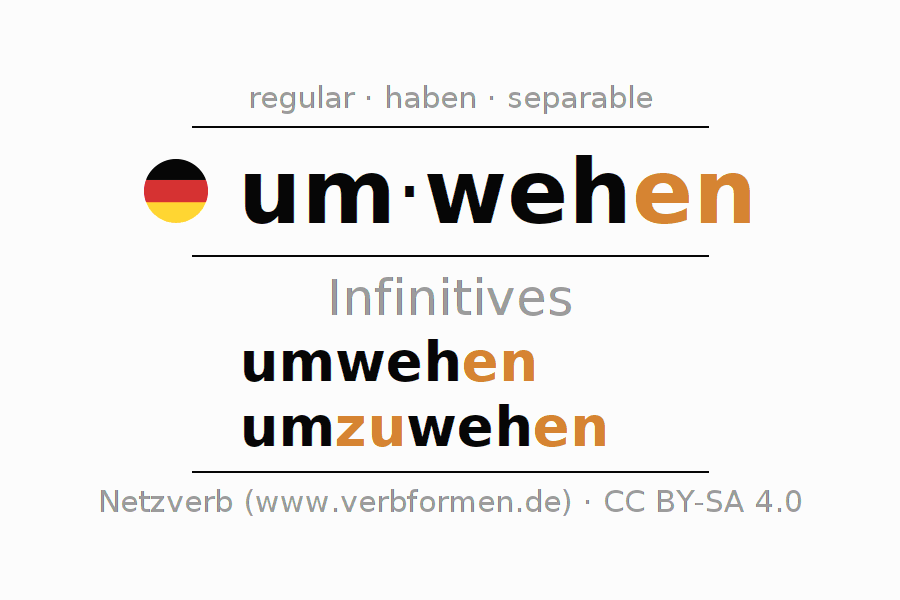 The conjugation of umwehen in Infinitive Present Perfect base form Active is umweh(e)n, umzuweh(e)n.The conjugation corresponds to certain grammatical rules. Likewise the requirements for the conjugation of the simple verb forms of umwehen in Infinitive. Comments ☆