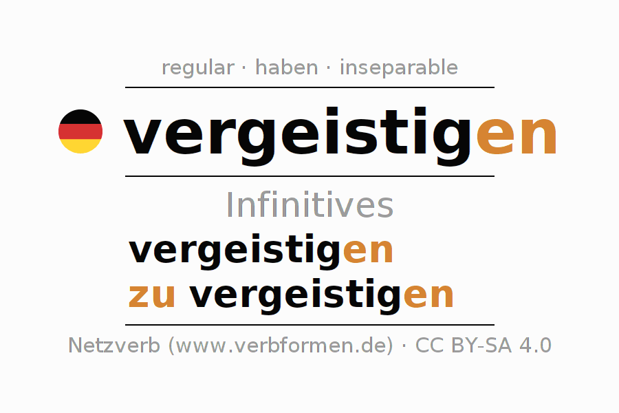 The conjugation of vergeistigen in Infinitive Present Perfect base form Active is vergeistigen, zu vergeistigen.The conjugation corresponds to certain grammatical rules. Likewise the requirements for the conjugation of the simple verb forms of vergeistigen in Infinitive. Comments ☆