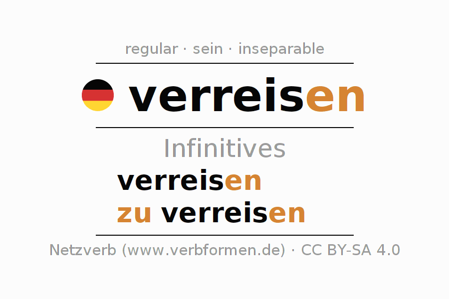 The conjugation of verreisen in Infinitive Present Perfect base form Active is verreisen, zu verreisen.The conjugation corresponds to certain grammatical rules. Likewise the requirements for the conjugation of the simple verb forms of verreisen in Infinitive. Comments ☆