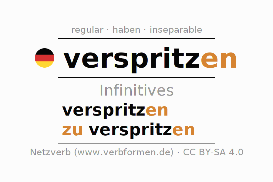 The conjugation of verspritzen in Infinitive Present Perfect base form Active is verspritzen, zu verspritzen.The conjugation corresponds to certain grammatical rules. Likewise the requirements for the conjugation of the simple verb forms of verspritzen in Infinitive. Comments ☆