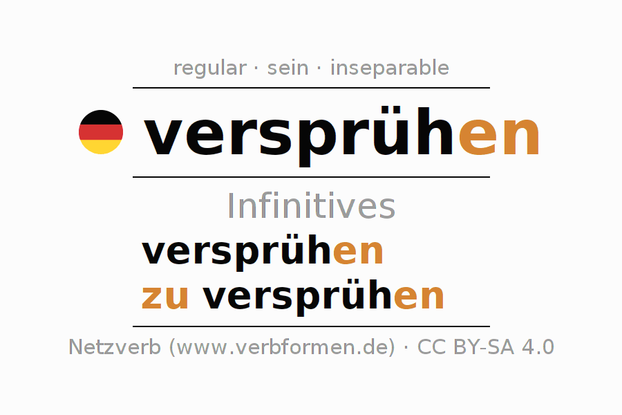 The conjugation of versprühen in Infinitive Present Perfect base form Active is versprüh(e)n, zu versprüh(e)n.The conjugation corresponds to certain grammatical rules. Likewise the requirements for the conjugation of the simple verb forms of versprühen in Infinitive. Comments ☆
