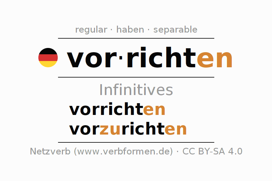 The conjugation of vorrichten in Infinitive Present Perfect base form Active is vorrichten, vorzurichten.The conjugation corresponds to certain grammatical rules. Likewise the requirements for the conjugation of the simple verb forms of vorrichten in Infinitive. Comments ☆
