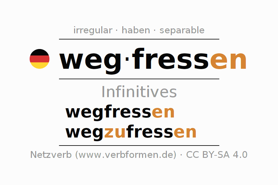 The conjugation of wegfressen in Infinitive Present Perfect base form Active is wegfressen, wegzufressen.The conjugation corresponds to certain grammatical rules. Likewise the requirements for the conjugation of the simple verb forms of wegfressen in Infinitive. Comments ☆