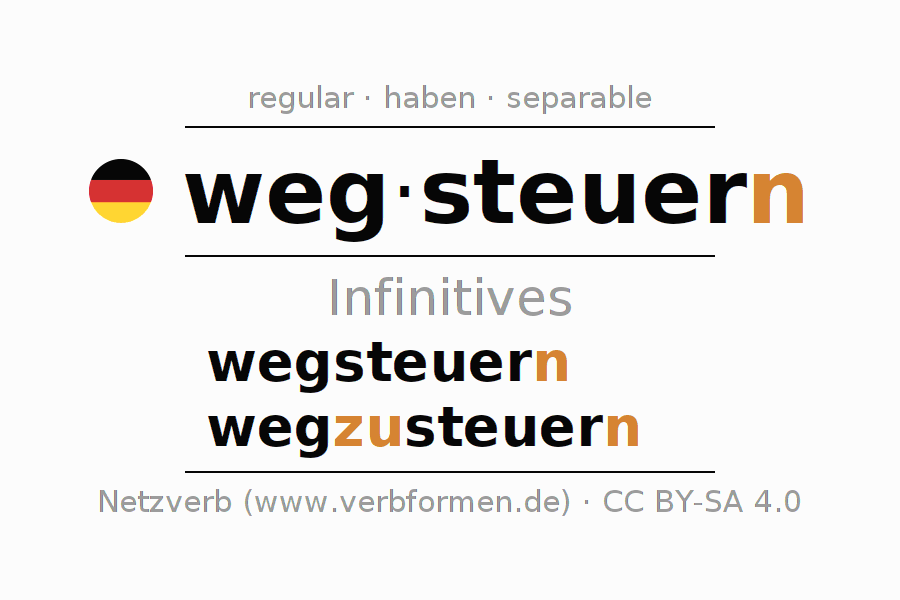 The conjugation of wegsteuern in Infinitive Present Perfect base form Active is wegsteuern, wegzusteuern.The conjugation corresponds to certain grammatical rules. Likewise the requirements for the conjugation of the simple verb forms of wegsteuern in Infinitive. Comments ☆